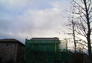 リビング上部の大きな吹き抜は回廊になっています。若い大工さんも頑張ってます。 |