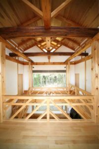 結果として、旧家の古材を全面的に再利用し、青ヒバを加えて主空間を造り、水廻りは青ヒバの内装でコンパクトにまとめ、大きな庇の下の開口部は木製建具にした。前庭は人車分離のアプローチにし、裏山を手入れをした上でリビングの借景とした。まさに「家にて森に住む家」となった。